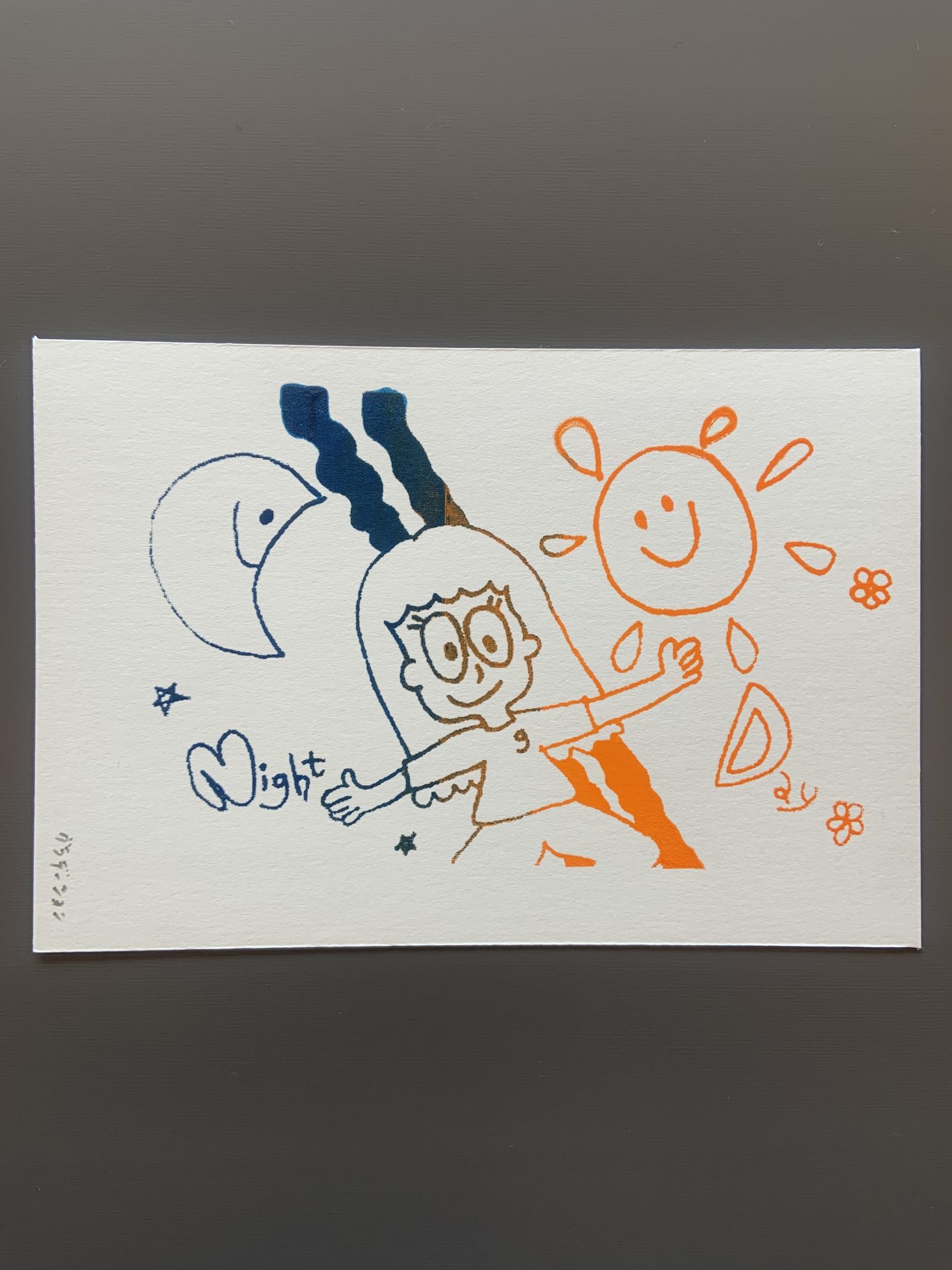 「オレンジ」と「ネイビー」のインクを使い、1枚の紙に昼と夜を同時に表現することを試してみました。