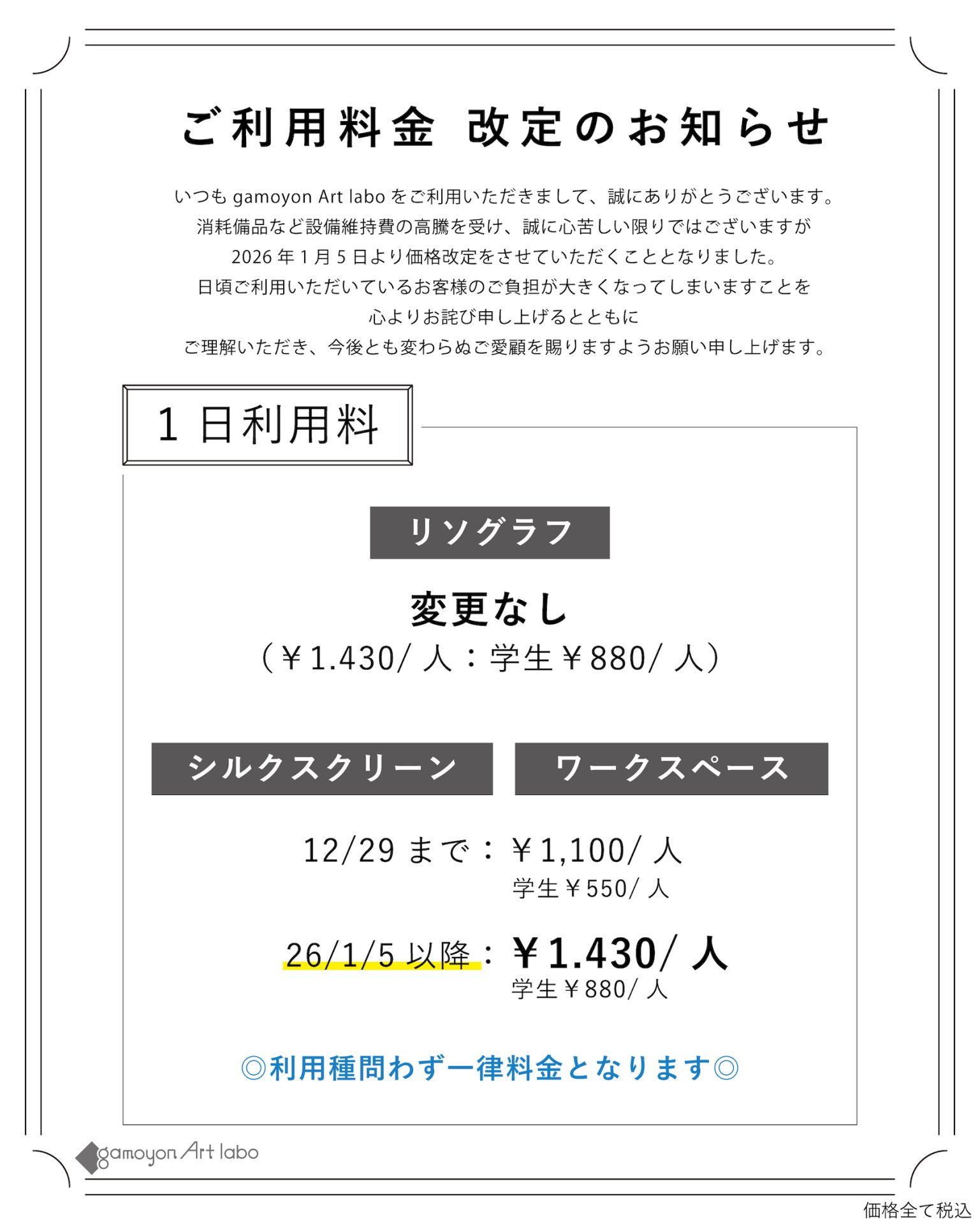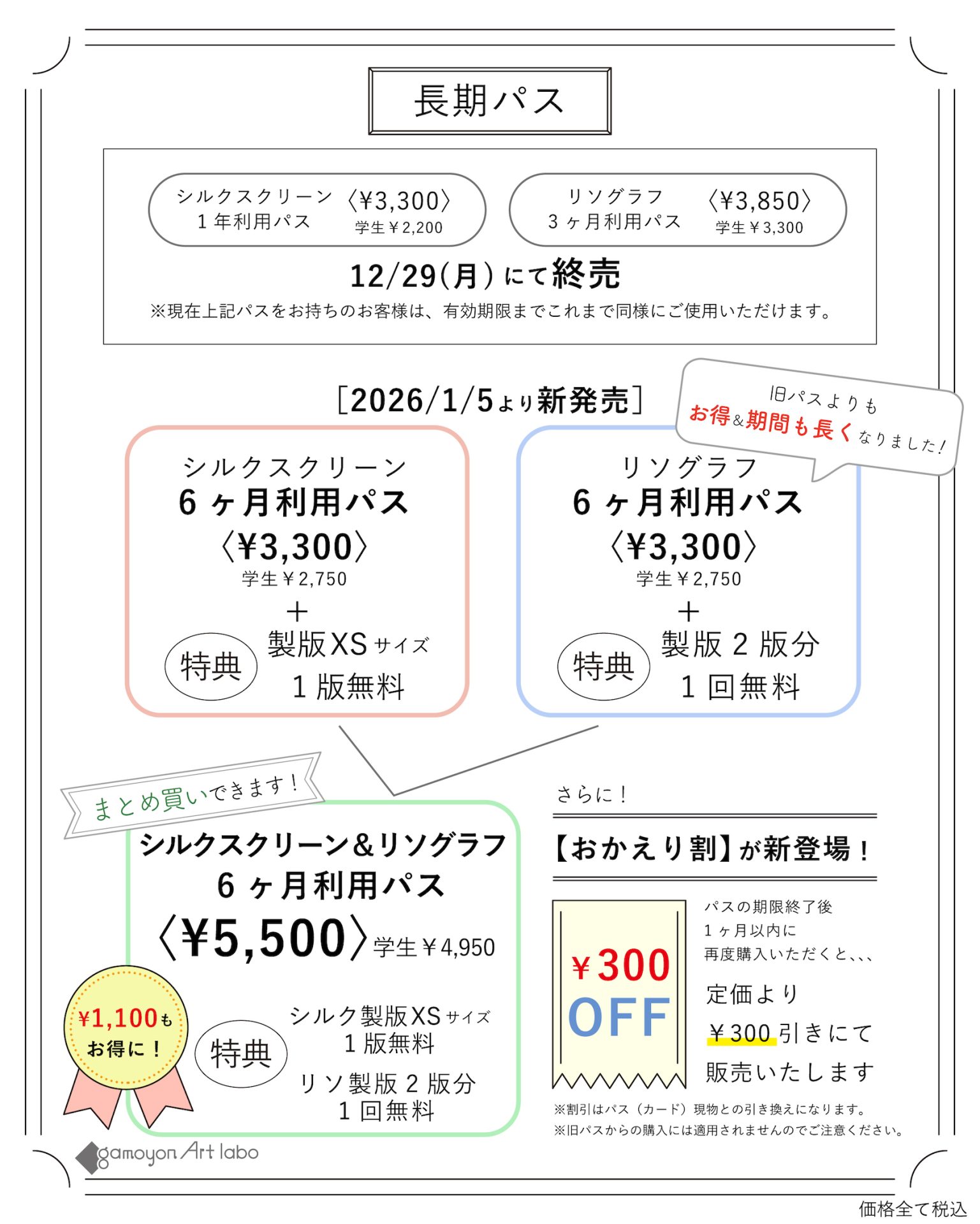 尚、「3ヶ月利用パス」購入者特典として実施しております「フリースペース制度」につきましては、2026年1月5日以降「シルクスクリーン&リソグラフ6ヶ月利用パス(¥5,500)」購入者への特典として継続いたします。
